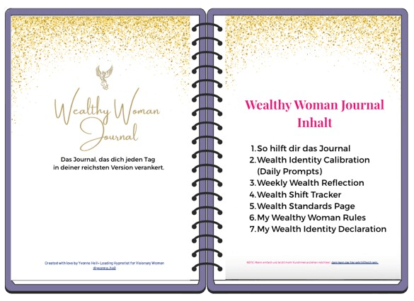 Du bekommst nicht nur die Sessions, sondern das Integrations-Tool, das deine Ergebnisse stabil macht. Das Wealthy Woman Journal ist für die nächsten 30 Tage dein täglicher Anker: ein Reminder, wie eine Frau denkt, fühlt und handelt, die finanziell stark ist. Damit du die Identität, die du dir im Vault aufbaust, nicht nur spürst – sondern jeden Tag lebst.