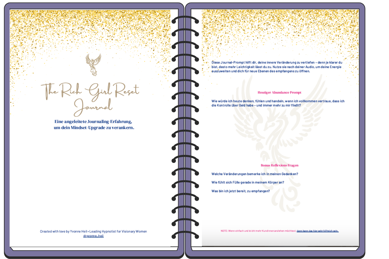 Du bekommst nicht nur die Hypnosen, sondern auch die Integrationstools, damit dein Reset wirklich bleibt. Das Rich Girl Reset Journal ist dein täglicher Reminder, wer du bist. Damit du deine neue Identität nicht vergisst, sondern Tag für Tag stärkst. Mit dem Abundance Affirmation Track gehst du hochfrequent, kurz, direkt ins Gefühl. Ein Audio, das deine neue Frequenz immer wieder festigt.